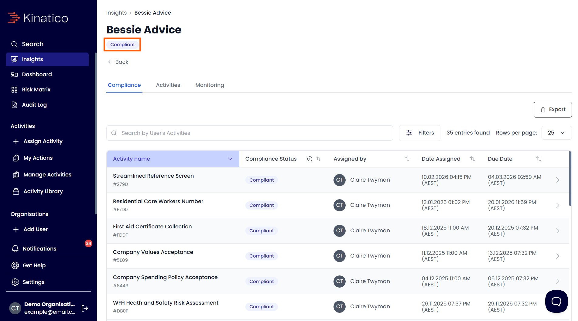 - At the top of the Insights page, see their compliance status listed under their name