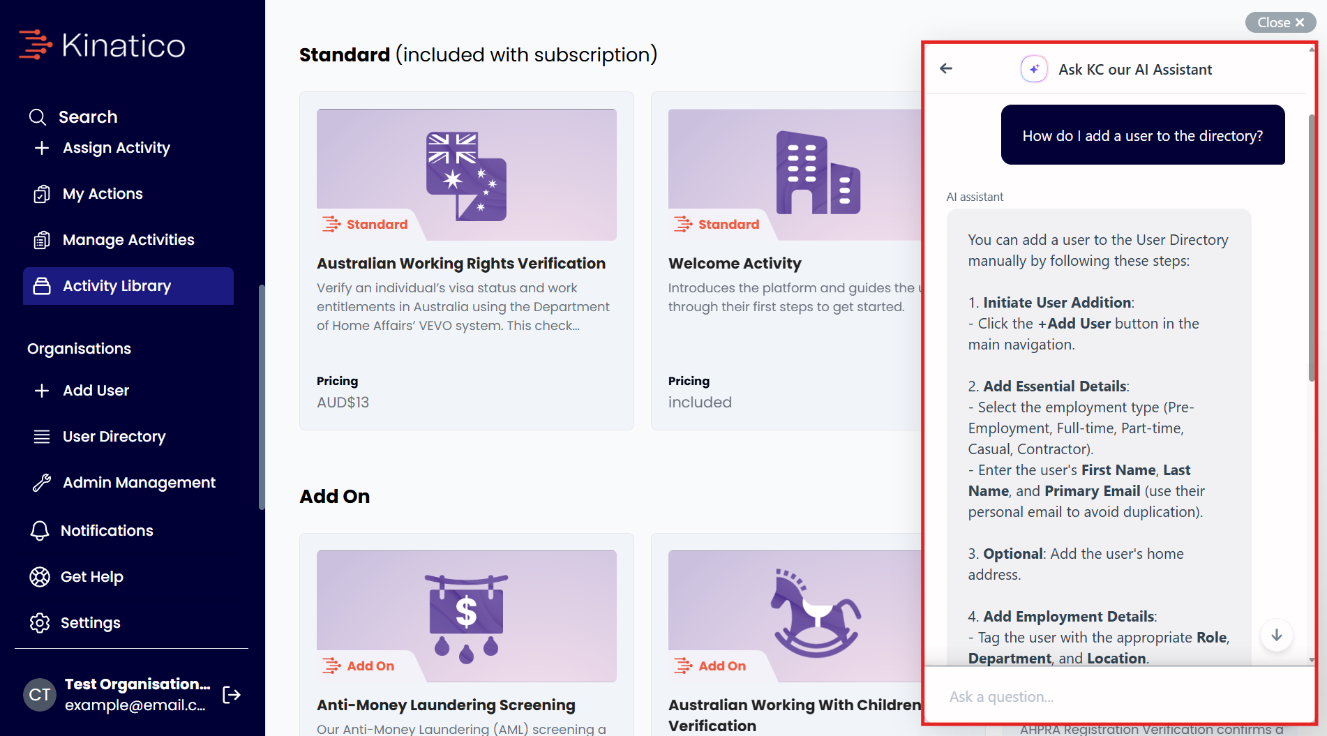 How to use: Type your question into the chat bar. The AI analyses our knowledge base in real-time to provide you with an answer.